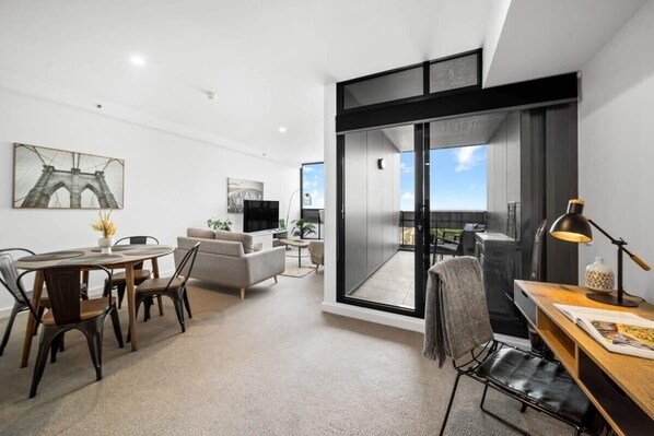 Levende 1 sengs CBD-lejlighed med udsigt over byen og parkering