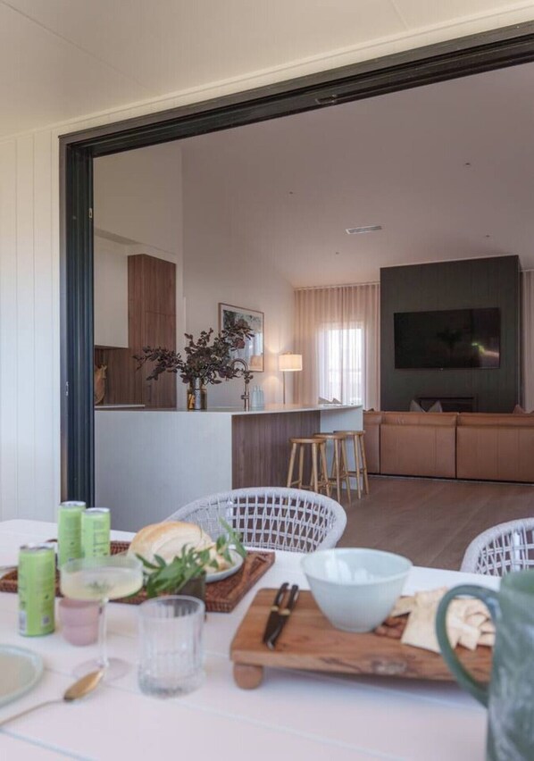 Three dreamy king bedrooms - finally a holiday where everyone gets the “good room” Each room has tv with Netflix, ceiling fans and luxurious linens Grand, moody bathrooms that feel like a quiet exhale A beautiful open-plan living space with room to gather and room to breathe. The living room meets you with grand, high ceilings and cosy gas fireplace for winter nights in. Reverse cycle ducted heating and cooling keeps the home comfortable year-round A location that’s pure magic - ocean at the end of the street, wine country over the hill Space to reconnect… and space to slip away and recharge Tide gently encourages slower mornings, long conversations and easy togetherness - with just enough room for everyone to find their own corner of calm.