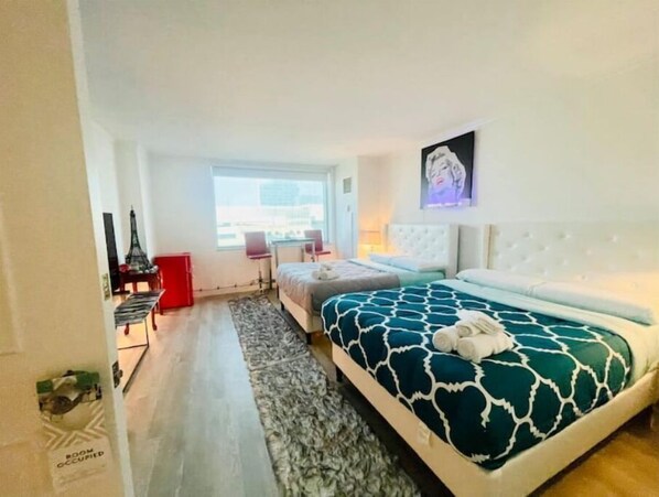 Oversized Suite #2 (on the right) with massive private bathroom & walk-in closet - excellent for family & children. The suite offers two queen beds with a brand new super deluxe premium queen Lucid mattresses & pillows. Each bed for 2 adults & also a comfy sofa for 1, total can sleep 5 people. (Air mattress for 2 people is available for a larger family.) The Suite Offers same amenities as the Suite#1. The room also has central AC/Heater, mini fridge/freezer, smart tv with all streaming services, dining table with 2 stools.