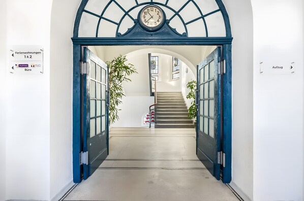 Additional amenities include private Wi-Fi (suitable for video streaming), TV with video-on-demand, washing machine, and a dedicated workspace. The ground-floor location with step-free access and private elevator ensures a convenient stay. The apartment is lovingly furnished with great attention to detail.
