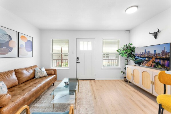 - 50” smart TV in living room with complimentary access to live cable (YouTubeTV), Disney+, Amazon Prime Video, HBO Max, Hulu, and ESPN+ for all your binge-watching needs