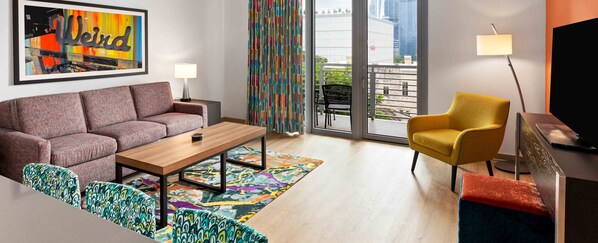 It features a cozy king-size bed and a queen sleeper sofa, ensuring a restful sleep after a day of exploration. The suite spans anywhere from 647-774 square feet, providing ample room for relaxation and privacy.