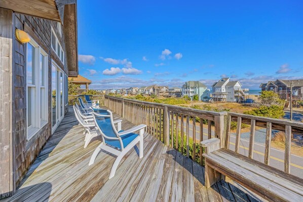 SEMI-OCEANFRONT Avon - Kinnakeet Shores. Undslippe til luksus og levevis, når du bliver på smukke BALI WIND. Din familie vil nyde de personlige detaljer, der findes i hele hjemmet, herunder øen-tema soveværelser. Huset ligger kun en kort gåtur fra Avon Fishing Pier og ligger lige over NC-12 fra Food Lion indkøbscenter. Men vigtigere er strandadgang lige over gaden. Et vejr indgang fører til første niveau dronning "bølge tema" soveværelse med privat bad, eller træde ud tilbage og flygte ind i den funklende private pool omgivet af en 7 'privatliv hegn. Det andet niveau af hjemmet har fire soveværelser; Kongen "Palms tema" soveværelse med tv, dronningen "Sol tema" soveværelse med TV, og to soveværelser, der deler en hall bad (2 singler "vind tema" og pyramide bunk "surf tema"). Alle fire soveværelser på dette niveau har adgang til det skyggefulde oceanside dæk og det praktiske vaskerum. På øverste niveau er en anden konge master suite, også med tv og adgang til øverste niveau soldæk. Det lyse store værelse byder dig velkommen med hvælvede lofter, mange vinduer og skydere til det store møblerede ocean-solterrasse med fantastisk havudsigt. Masser af underholdning findes i det store rum komplet med 51 "HDTV og dvd-afspiller. Læn dig tilbage i den komfortable Lazy Boy-læder lædermøbler foran den hyggelige 3-sidede gas pejs. Køkkenet med rustfrit stål apparater og morgenmad bar er perfekt udstyret til madlavning og madlavning og er kun få skridt væk fra gourmet 2-brænder gas grill lige ud på dækket. Professionelt indrettet til charme, stil og komfort, er dette BALI WIND den eneste destination for din familie i år.