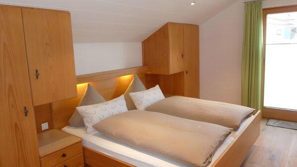 A high-quality wooden bedroom with double bed, safe, and LCD satellite TV ensures restful sleep. The spacious bathroom with bathtub, shower, toilet, hairdryer, bathrobes, and cosmetic mirror offers plenty of space to unwind. A workspace with desk and LAN connections is available in two rooms. Enjoy the large, furnished south-facing balcony with mountain views of the “Hörnle.”
