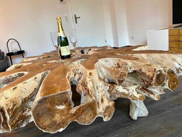 Den rummelige og totalrenoverede Schiller Suite byder dig velkommen til 110m². Ser frem til lyse, store og høje værelser såvel som eksklusive møbler, fra XXL-sofaen til et køkken af høj kvalitet til 2x2m kassefjærsen. Schiller-suiten har 2 soveværelser, hver med en boksfjederseng inkl. Sengelinned, et 32 tommer fladskærms-tv, et skrivebord med passende siddepladser og en stor garderobe. Stuen betager på den ene side den eksklusive atmosfære, men på den anden side også med XXL relax-sofaen, det 65 tommer Smart TV (inkl. Streamingtjenester såsom Netflix eller Amazon Prime) med en Bluetooth-aktiveret lydbjælke. Det fuldt udstyrede køkken med køleskab med fryser, opvaskemaskine, ovn, mikrobølgeovn og alt andet sædvanligt redskab efterlader intet at ønske. Nyd din morgenmad eller om aftenen et glas vin på den direkte tilstødende terrasse eller brug grillen til en lækker grill. Du kan slappe af i det elegante brusebad med walk-in bruser og håndklædevarmer. Der findes en hårtørrer og et tilstrækkeligt antal håndklæder. Schiller-suiten inkluderer også et gæstetoilet og en lille undersøgelse med et skrivebord og passende siddepladser.