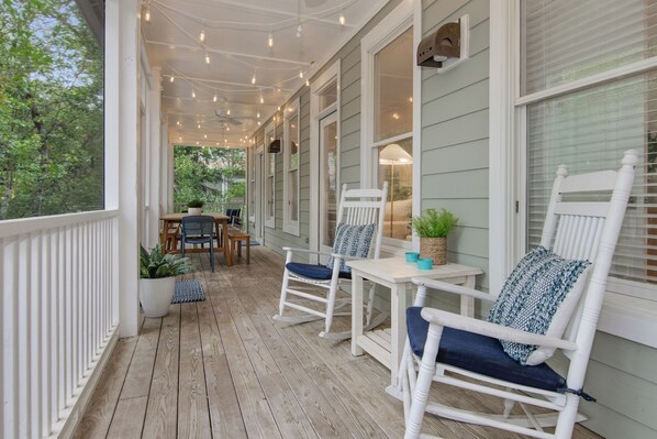Kom og nyd denne hyggelige 3 værelses 3. 5 badeværelser hjemme i Maritime Forest of Bald Head Island. Nedenunder går du ind i et åbent koncept-opholds- og spisestue med et stort velassorteret køkken. Fra stuen er dit soveværelse med en queensize seng og et vedhæftet grand badeværelse med dobbelt håndvask, suge i badekar og gå i brusebad. Gå ovenpå for at finde en anden opholdsstue der er fantastisk til underholdning for børn. Til højre er et soveværelse med en queensize-seng og køjeseng. Til venstre er et soveværelse med en queensize-seng. Begge soveværelser har fritliggende badeværelser og går i brusere. Nyd baghaven ved at sidde i gyngestole med din morgenkaffe eller solnedgangscoctail med udsigt over Bald Heads natur og udsigt til golfbanen. Der er 2-4 passagergolfvogne til dit brug, og et BHI-klubmedlemskab med golfprivilegier er tilgængeligt for et separat køb direkte fra klubben.