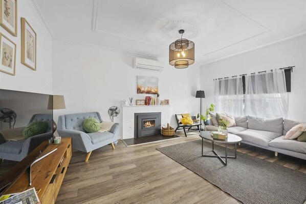 The living room is warm and inviting, with a brick fireplace at its centre and heritage features that speak to the home’s past. It’s a comfortable space to gather, whether to enjoy a quiet evening or simply take in the atmosphere of a true Ballarat cottage.