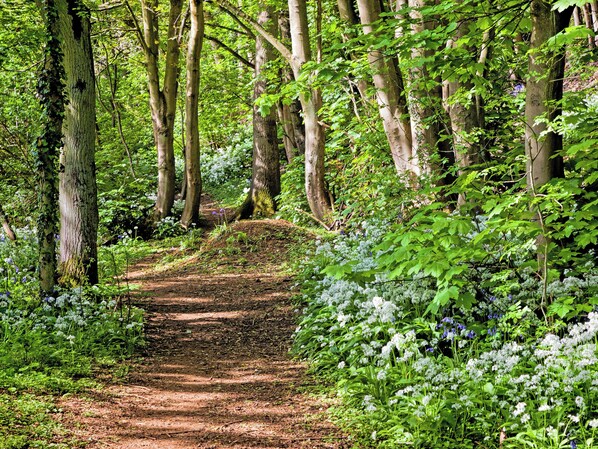 - 9 trin derefter kort sti til stor lukket have med møbler