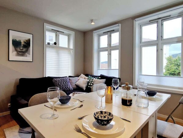 You are close to shops, cruise ships, bathing areas, fitness center, cobblestone alleys, parks, theaters, restaurants, cafes, and everything Bergen has to offer.
