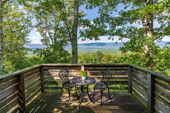 The deck and fire pit was pretty much where we stayed most of the time. Loved the views and having morning coffee outside! Cacapon State park was so very close and beautiful! My friend went fishing there, as well! Loved having access to a grill and to the hot tub. So many birds to enjoy listening to, as well!