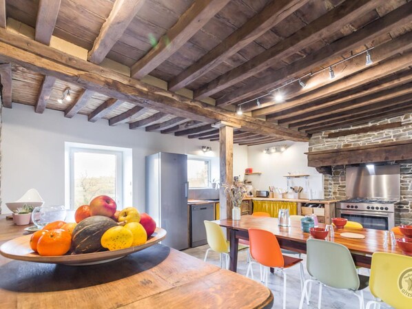 Detached house. Living room (TV, Wi-Fi, stereo). Dining room with kitchenette (oven, dishwasher, large refrigerator, microwave). Separate WC. Bedroom 1 (1 double bed 140x200cm) with en-suite shower room. Ground floor wheelchair accessible. Laundry room (washing machine, dryer, freezer). On the first floor, mezzanine with games, bedroom 2 (3 single beds 90x190cm, 2 of which can be joined) with en-suite shower room, bedroom 3 (2 single beds 90x190cm that can be joined) with writing desk, bedroom 4 (1 double bed 140x190cm) with desk, shower room and separate WC. Baby equipment available on request. Bed linen and towels for hire. Cleaning service available at an extra cost. Geothermal heating included. Private enclosed garden. Terrace. Garden furniture. Barbecue. Petanque court. Swing set. Garage. Shelter. Parking. Horse riders welcome. One wheelchair and one adapted toilet seat are available upon request. Pets are allowed on the ground floor only. Electric vehicle charging point is available for an additional fee. Meandering through the Normandy countryside, the Vire River has sculpted lush, rolling landscapes. Ideal for outdoor activities (hiking, mountain biking, horseback riding, kayaking), this area is also perfectly situated in the heart of the region for discovering the gems of Normandy. Not far from the riverbanks lies this authentic country house. After years of hard work, Hervé successfully completed the challenge of fully restoring this former cider press. The magnificent beams and stone walls bear witness to this monumental undertaking and lend it a warm atmosphere. This house is a pleasant place to live, and younger guests will particularly enjoy the spacious mezzanine upstairs. Hervé, a qualified educator, can lead one of your nature outings if you wish.