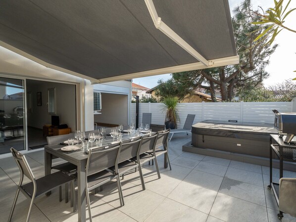 Enjoy a beautiful furnished terrace with garden furniture, a pizza oven, a gas griddle, and an awning for al fresco dining. The jacuzzi is only available for weekly rentals, with a flat-rate supplement.
