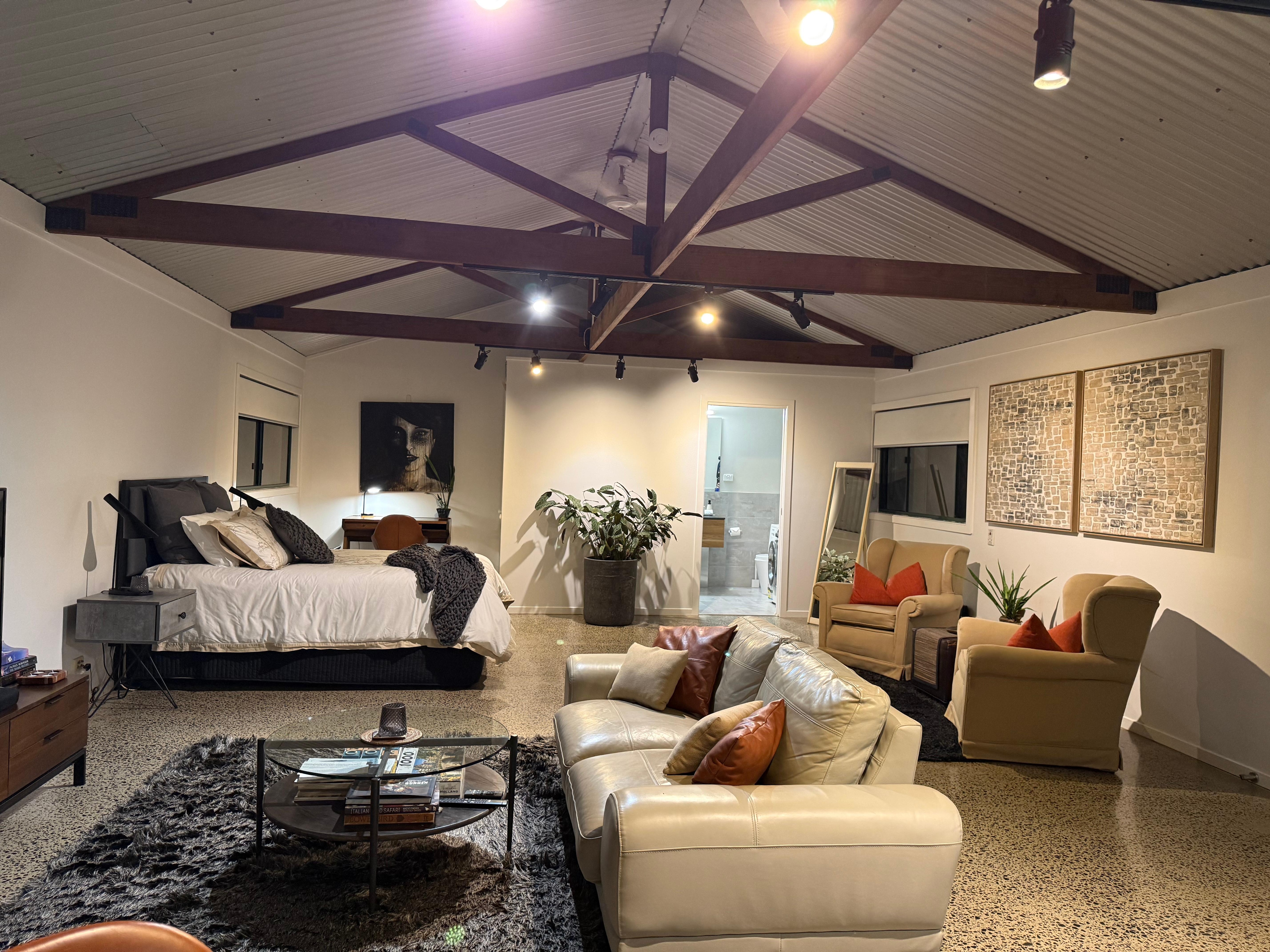 Your spacious (72 sq. metres) studio touts exposed wooden trusses, contemporary furnishings, polished cement flooring, fully equipped kitchen, modern bathroom and a wood fired heater (firewood provided). A 55 inch Smart TV with Netflix plus a Bluetooth enabled sound bar are provided for your viewing and listening pleasure. Organic cotton bed linen, towels, organic toiletries, tea , coffee and cooking essentials are included. Stay a couple of nights or even a week or more as the kitchen is equipped with pots and pans, crockery and modern appliances including a full-sized fridge/freezer, microwave oven plus a gas oven and cooktop.