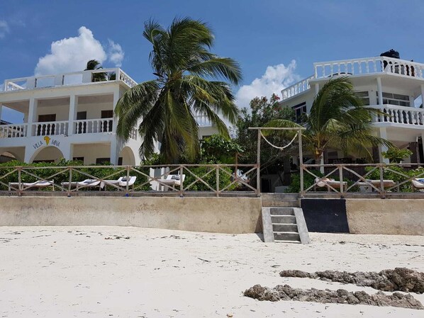 Huset har en privat strand og ligger lige ved vandet (strandpromenaden), en lille balkon med 2 liggestole og et bord og 2 stole. Fra soveværelset med havudsigt har du en vidunderlig solopgang hver morgen. Huset har en privat bar og en restaurant, hvor næsten ethvert kulinarisk ønske kan opfyldes. Fra den store tagterrasse kan du nyde en vidunderlig solnedgang. Perfekt til bryllupsrejse eller til dem der ønsker at blive en. Efter anmodning kan der arrangeres smukke strandbryllupper.