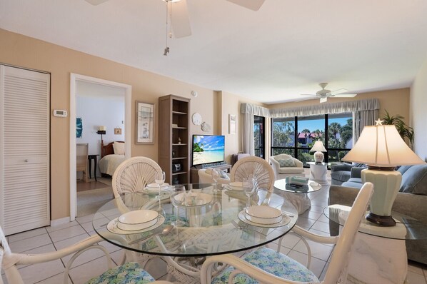 Runaway Bay 212 is a fully furnished 1-bedroom, 1-bathroom condominium in the centrally located Runaway Bay community. The Runaway Bay complex is situated in the middle of Bradenton Beach around many shops and restaurants. Runaway Bay also has private beach access available to its residents and guests as well as a private fishing dock and kayak launch, so it is the perfect place to stay if you plan on doing any excursions throughout your stay. It is unit #212 on the second floor with a great view of the pond. In addition to the large windows to encapsulate the view of island life outside, there is a screened-in lanai to enjoy your morning coffee and take in the view. The bedroom features a King bed, TV, and plenty of closet space. The bathroom has a walk in-shower and is accessible from either the hall or the bedroom. The kitchen is well equipped with everything you could need to cook a great dinner for two or the family. To make your stay as comfortable as possible, there is a stackable washer and dryer in the unit to use at your convenience.
