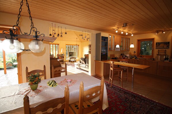 I køkkenet er der: opvaskemaskine, mikroovn, kaffemaskine, espressomaskine, kedel, brødrister, keramisk kogeplade med ovn, køleskab med fryser og masser af service, bestik og køkkenredskaber. For vores små gæster er der ekstra børns skåle og bibs. Ved spisebordet er en høj stol klar. For søskende, der stadig er for lille til at sidde på stolen, er der et separat booster sæde til den normale stol.