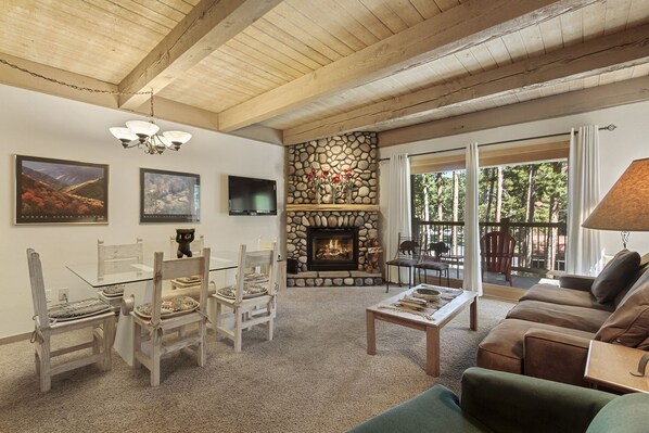 Enjoy the mountain breeze while sitting on the covered balcony. Or cozy up by the fireplace after a on the slopes.