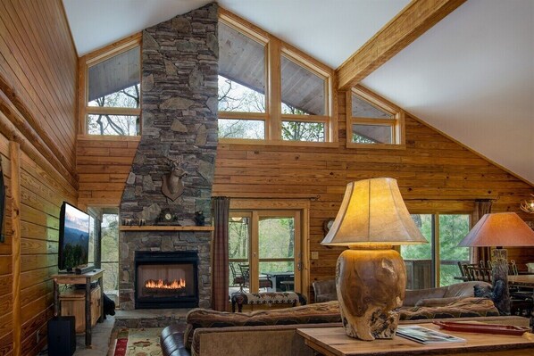 The master suite on the main level has custom tile shower, king sized bed and a TV. There is a sliding glass door that opens to the large deck and decor is rustic, log cabin decor.