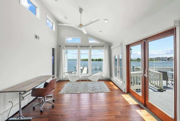 - Massive windows looking out to the pool and the bay