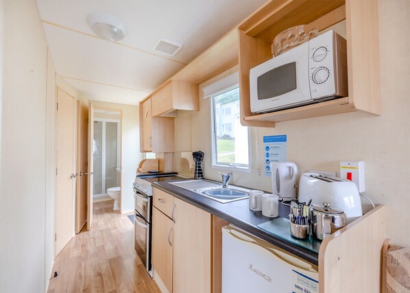 well-equipped caravan with one double and one twin bedroom. Walk in shower. Heating throughout. Please note most of these caravans have steps up an external pathway leading to the caravans. No pets.