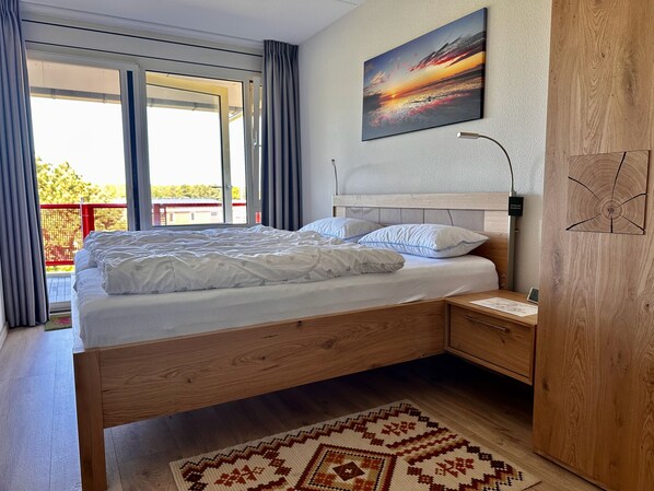 Den store vestvendte balkon - udstyret med teakmøbler (klapbord og to komfortable stole med fodafdeling) - tilbyder en vidunderlig uhindret udsigt over solnedgangen.