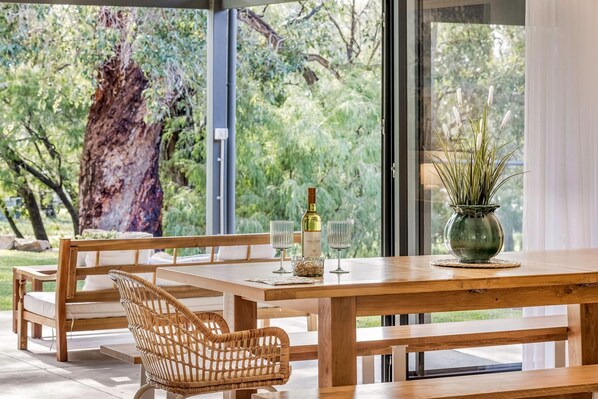 Sliding doors from the living area provides direct access from the kitchen to the alfresco eating area. which is the perfect place to relax and enjoy a glass of local wine prior to firing up the BBQ for dinner. You are quite likely to see kangaroos and some amazing bird life in this natural bush setting.