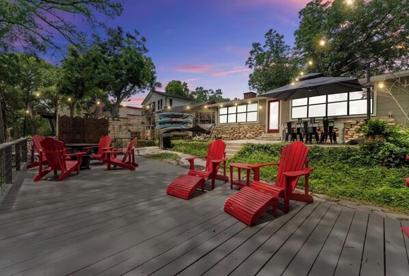 Outside we offer a large back living space with stairs that lead down to multiple seating levels and direct access to the river. The patio and deck include a large dining table that seats six, a propane fire pit, a propane grill, chiminea, as well as multiple places to sit and enjoy your coffee in the morning or cocktails at night. The cabin also provides lots of fun with four kayaks, four paddleboards, fishing gear and much more.