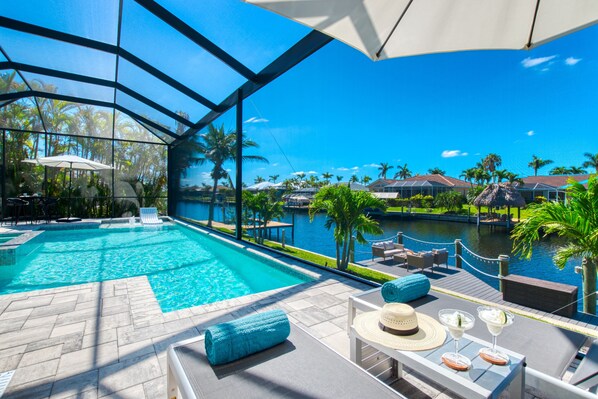 Enjoy a cool drink on the spacious dock right next to the canal, and watch the fish play in the water or the spectacular sunsets of Cape Coral.