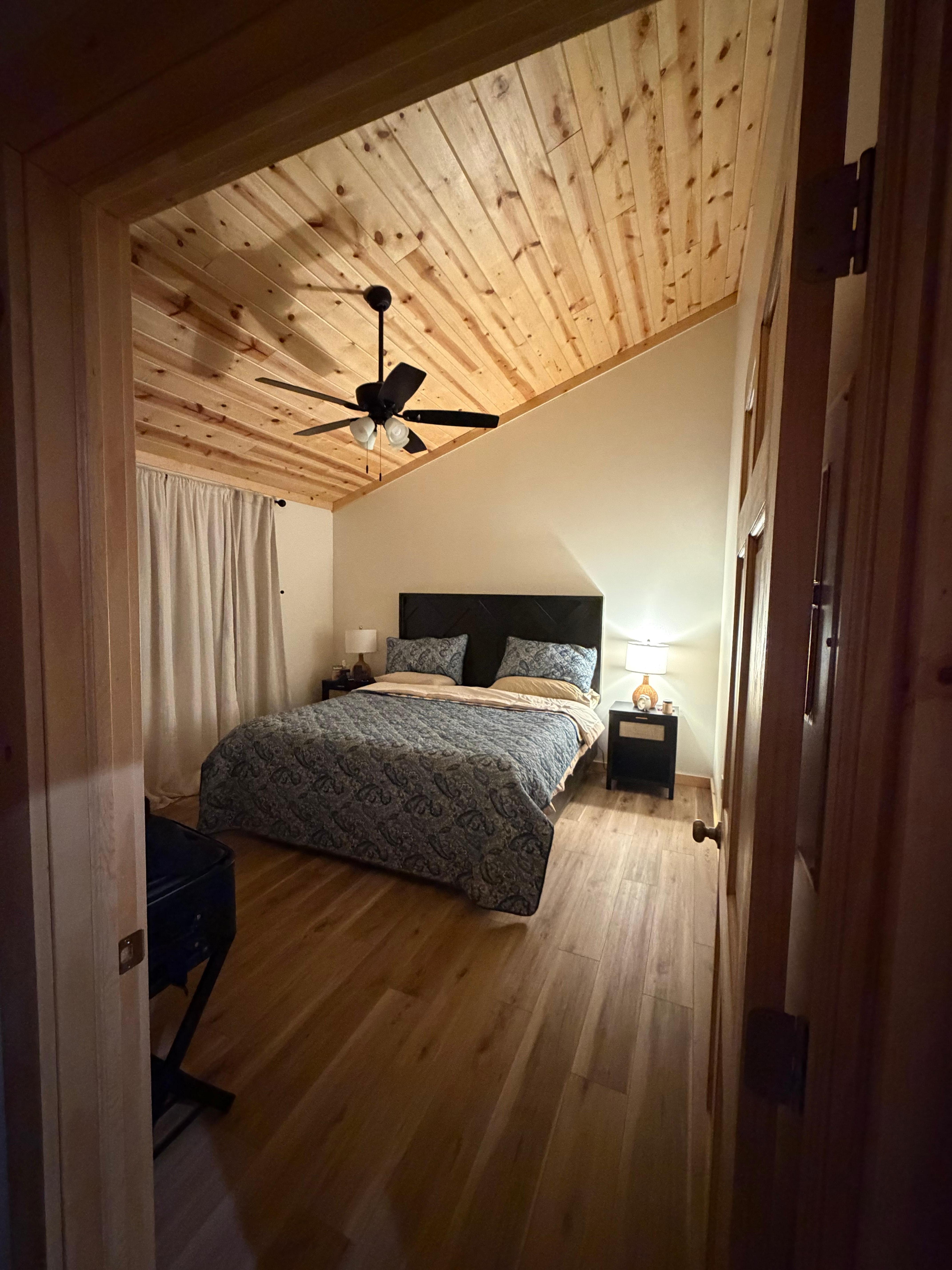 Black Bear at Woodland Cabins: Black Bear is a one-bedroom layout, with a king sized bed, offering privacy between the sleeping area and the living/kitchen area. The sofa located in the living room, converts to a queen sleeper which is perfect for two children or one additional adult. Walking distance to the cabin lies a three-acre pond, inviting guests to enjoy fishing and leisurely strolls along the dam. Our wooded areas and fields are perfect for exploration and contemplative walks, where observing diverse bird species and wildlife becomes a cherished pastime. Regular guests include deer, wild turkey, red foxes, pileated woodpeckers, songbirds, and migrating waterfowl. For the fortunate observer, catching a glimpse of "Fraidy," the bobcat, adds an extra touch of wilderness charm!
