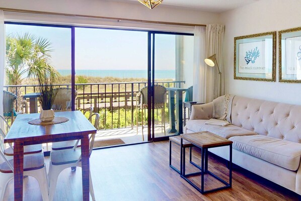 Enjoy perfect ocean views, the sound of waves crashing on the beach, dolphins frolicking in the surf, and amazing sunrises all from your private balcony in this first floor condo (with an elevator!!). No need to load up the beach wagon and trek across roads, La Mare Vita is on the ocean!