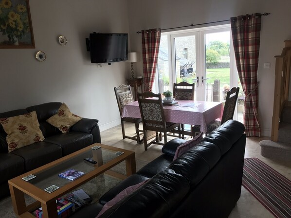 Døren åbner ind i stuen med dobbelt højde, med masser af plads til hele din fest, et spisebord placeret foran de dobbelte terrassedøre, så du kan nyde din udsigt som du spiser og et vægmonteret tv. Bemærk venligst, at en af sofaerne er en sovesofa.