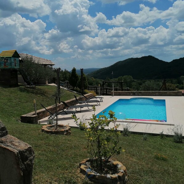 In the spacious garden, you will find a pool with sunbeds and an outdoor shower. In the corner next to the pool, there is a barbecue and sitting area where you can enjoy preparing food or just relaxing. Kids can enjoy fun activities on the playground that is part of the property. All of this makes Villa Gologorički Dol a perfect getaway for families!