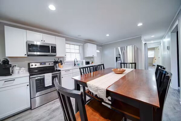 The contemporary living room boasts ample seating options, including a spacious and comfortable sofa and 60in HDTV with multiple streaming options to choose from. The dining and kitchen area offers plenty of room for gathering and preparing delicious meals.