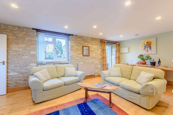 Sunny dual aspect with exposed stone walls, solid beech flooring, exposed beams, large fireplace with Jotul wood burning stove, two two-seater sofas, Smart TV with full BT package, armchair, window seat and a wooden dining table that comfortably seats ten guests