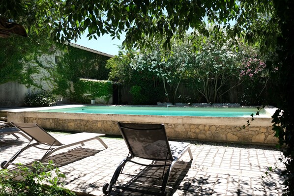 A pleasant private chlorinated swimming pool in service from April to the end of October (8m x 4m, depth from 1.50m to 1.90m, with access by steps and secured by an alarm).