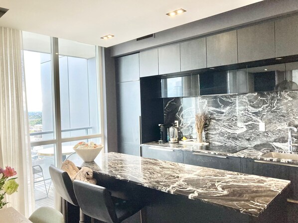 Chicago luxury home suites har 3 værelser med fælleskøkken. Køleskabe og mikrobølgeovne stilles til rådighed.