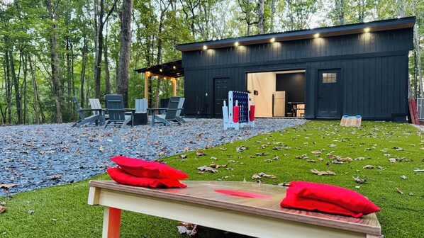 Directly outside the game room is a regulation turf area set up for lively cornhole games. Gather your family for a fun-filled competition or simply relax and enjoy the beautiful mountain views.