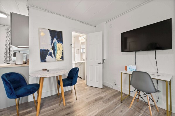 The home’s interior will serve as your private oasis between adventures, outfitted with exactly everything you need to maximize your stay. Kick up your feet and recline back on the bed to stream episodes of all your favorite shows on the mounted smart TV. A dedicated workspace allows you keep current with emails or take a focused call when needed. The streamlined kitchen is well-equipped for preparing light meals as well as storing all your snacks and beverages. The chic café table for 2 is the perfect spot for dining as well as a spontaneous game or two of cards. In the peaceful morning hours, take your freshly brewed coffee out into the courtyard to soak in the fresh air as you plan out the activities of a new day.