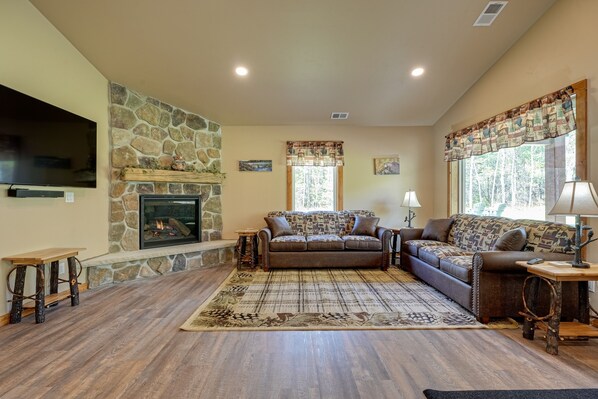 Inside both cabins, you'll find bright, welcoming interiors and a cozy atmosphere throughout the well-appointed living areas, all blanketed in natural light. Relax and make yourself at home by resting on the plush furniture, streaming movie marathons on the large TVs, or curling up in the glow of the grand stone fireplaces. The open-concept floor plans were designed with togetherness in mind so that no conversation would be lost here. Create culinary charms and snacks for your outdoor adventures in the sophisticated eat-in kitchens, equipped with brand-new appliances, ample cupboard room, and rustic dining tables. Host barbecues, serve cocktails, or sip your morning coffee on the patios while listening to the tranquil sounds of nature, and then gather around the firepit as the stars come out.