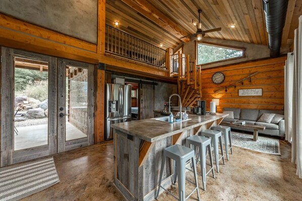 Bobcat Cabin has an open floor plan common area (living room, kitchen, and bar-style dining), a master bedroom (1 king bed and a twin bunk), a loft-style sleeping area (with two full-size beds), and a full-size bathroom with a washer and dryer. The outdoor space features a private dining area with a private hot tub, gas grill, and a small fire pit.