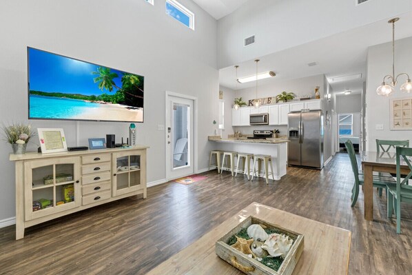 Enjoy relaxing after a fun filled day at the beach on the cozy living room sofa while watching your favorite shows on the Smart flat screen TV or sit on the outside porch to unwind. The dining table seats 6 with an additional 3 at the breakfast bar.