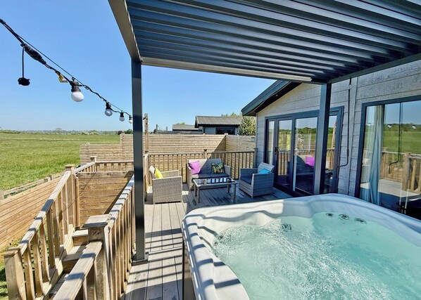 This contemporary, pet-friendly two-bedroom lodge is a great place to enjoy a relaxing stay with stunning views. The master bedroom has a king-size bed, Smart TV and en suite shower room. One twin bedroom, a family bathroom with overhead shower. The spacious and modern open-plan living/dining/kitchen has floor to ceiling windows and is the perfect place to socialise. Enjoy movie nights in front of the 55 inch Smart TV, whilst others play on the combined pool table/table tennis/diner. If that’s not enough the retro arcade machine with 100’s of classic games is a fun alternative and a real throwback. French doors lead out to uninterrupted field views from the private raised decking area with rattan sofas and an outdoor hot tub. Step down to the securely fenced grassy area ideal for your pooch which includes a BBQ stand and picnic bench. Festoon lights complete the outdoor space creating the perfect evening ambience. Parking available outside the lodge. Pets accepted (surcharge applies).. Hoseasons’ Best In Britain Award 2024 Winner – Large Park.