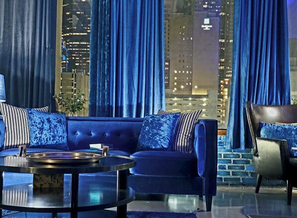 Romantic Blue Retreat. 1b 1b trendy loft with lux skyline views + Free Parking