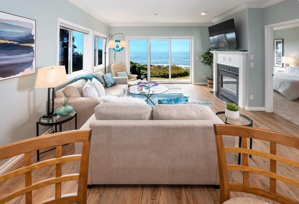 Experience breathtaking sunsets, spectacular oceanfront views, the warmth of a cozy gas fireplace and whale watching create the perfect atmosphere for romance at Sunset Serenity, our fully remodeled spacious corner 2-bedroom condo in Depoe Bay.