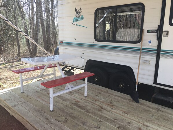 The property was neat and well lit with solar lights. The camper was somewhat tinier than we expected but it suited our two night stay. The camper was very clean and had everything we needed from lovely lofty bed pillows to coffee! Loved the outdoor porch facing into the quiet woods! We will come back!!