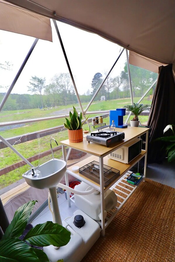 This is one of three glamping domes on the property. If you are traveling with a larger party or would like to inquire about the other domes, please let us know!