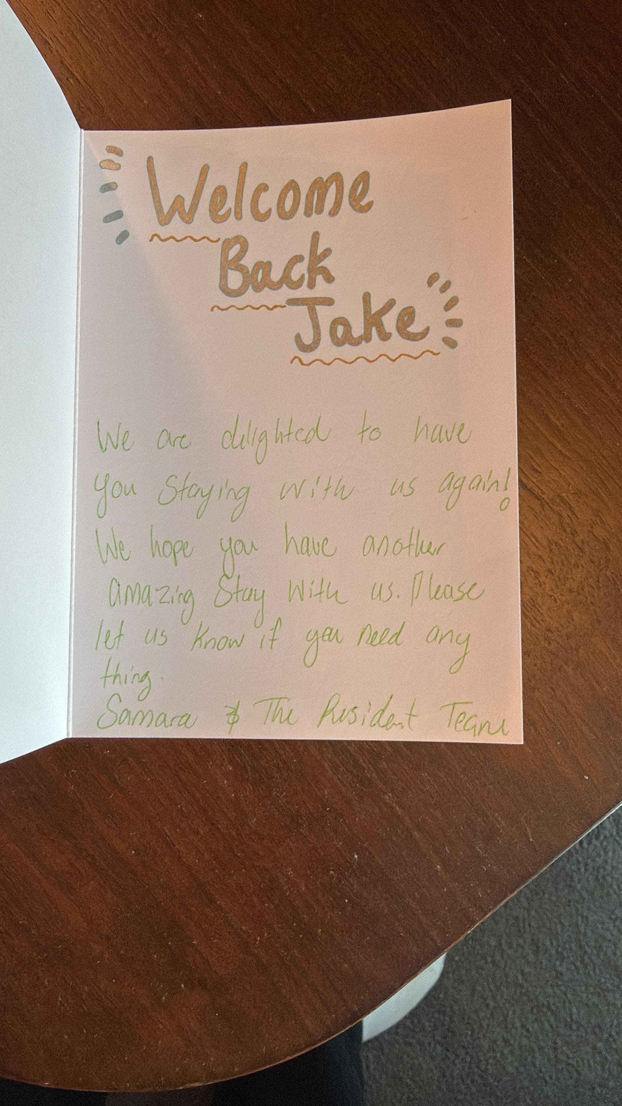 Everything was great. Our second time staying after they saved us from a really poor hotel last year. This is a great hotel and they always treat us amazing. It was great to have such a nice view and the team gave us a lovely card welcoming us back. We will always stay here when visiting.