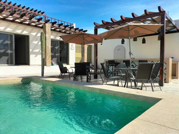 The entire Cerritos Dreams development is walled, with secure off-street parking for your vehicle. There is also a shared central pool with a gas BBQ, shaded palapa, lounge chair seating, dining seating, bar seating and outdoor fitness equipment. The pool area also has its own bathroom and shower for clean up. Grill some fresh fish on the BBQ while watching the spectacular Cerritos sunsets from the pool area. It is a great space for hanging outdoors for family-style meals, games, or just an afternoon siesta in the sunshine.