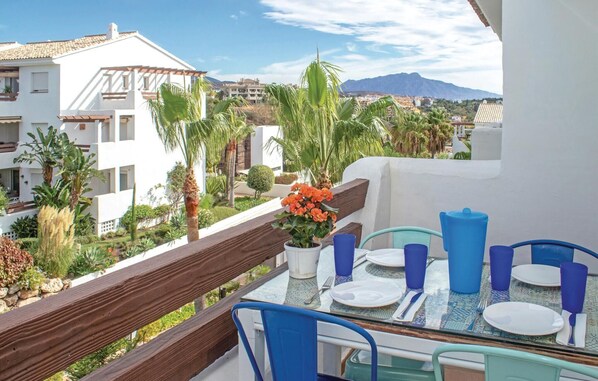 Den smukt møblerede lejlighed ligger på 2. sal og kan nås med elevator fra garagen eller i stueetagen. Der er et fuldt udstyret køkken med en separat udvendig terrasse og en spiseterrasse med udsigt over de smukke haver og bjerge. Terrassen er udstyret med en markise, der giver skygge. Loungen fører til den store sydvestvendte terrasse.