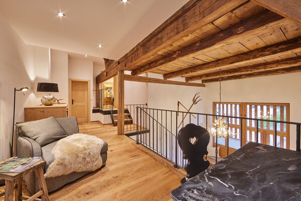 A special highlight is offered by a cosy, weather-protected loggia, which can be reached via the upper floor and offers a fantastic view of the mountains. The perfect place to enjoy the sunset.